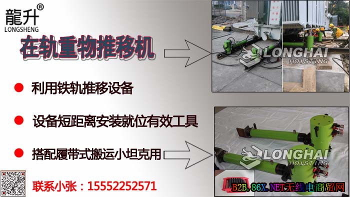 在轨重物推移机利用铁轨搬运设备,通常适合搬运大型锅炉、变压器、填海、桥梁搬运等,可与履带式搬运小坦克配套使用。