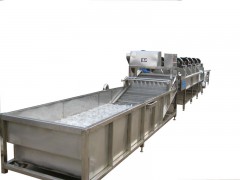 该流水线主要由清洗段、提升输送段、振动沥水段及风干除水段组成,主要用于袋装食品的高低温杀菌后,产品表面油垢、污渍的连续清洗及风干,并可直接并入装箱线实现流水化生产。