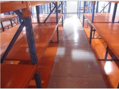 通常使用中型层板式货架或重型横梁式货架做主体,配合叉车或液压升降平台上下楼上货物。多层搁楼式货架能够简单高效的利用仓库空间。
