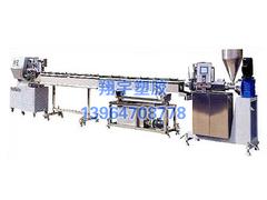 该生产线的产品主要应用于医用输液。该生产线是我公司采用欧洲先进技术,经消化吸收,研制开发的新型管材生产线,适用PVC/PE/PU管材的高速挤出,该生产线外形美观,自动化程度高,操作简单生产稳定可靠。生产线由控制系统,挤出机,机头,冷却系统,牵引机,微电脑切断机组成。采用松下PLC和PROFACE触摸屏组合的先进控制系统,具有完善的故障自我检测功能,友好的人机对话功能,温度控制模块化功能,工艺参数存取功能。