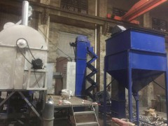 一套好的热法覆膜装置,必须能较好地满足覆膜工艺对设备的要求。热法覆膜工艺是 一个兼有物理和化学变化的过程:首先要把常温的原砂加热到一定温度(一般在130~160℃);热砂和树脂进人混砂机后,树脂受热熔化,两者得到均匀混合,树脂包覆在砂粒周围;加人固化剂乌洛托品水溶液后,一方面由于乌洛托品受热分 解释放出亚甲基使树脂发生一定程度的聚合,另一方面由于水受热蒸发带走热量使砂温下降,同时型砂出现结团但在混砂机的作用下又得到不同程度的破碎;然后加人附加剂硬脂酸钙并得到均匀混合;较后型砂卸出混砂机外,经进一步破碎冷却,再筛分后待用。从铸造车间运来的旧砂,经振动破碎机破碎筛分后,通过磁选分离出旧砂中的铁块,由斗式提升机将破碎筛分后的旧砂送人中间贮砂斗。旧砂进人中间贮砂斗前,再次用磁选机分离出砂中的铁质微粒然后贮砂斗下的螺旋给料机根据焙侥炉的处理能力及炉内工况连续均匀地将旧砂加进热法再生设备,旧砂经热法再生设备预热后进人焙烧炉内。