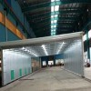 整体移动式喷漆房的设计目的,是为了较大型工件打磨或喷漆的需要。一般情况下每套房体对应2-3个排风净化工位,哪个工位上的工件需要喷漆时,房体则行走移动到那个工位,其他工位可以继续打磨工作,待房体内的工件喷漆完毕后,再控制移动房体行走到打磨完毕的工件工位,如此设计可以实现大型工件的不间断连续喷漆工作。房体为钢结构构造,房体立柱设置有两台电动驱动行走机构,行走机构沿地面轨道行走。移动房体两端设置有电动卷帘大门,房体行走时,大门升起,待到达位置时,大门降落关闭。大门与行走机构由电气控制部分连锁控制,大门升起后,房体才可移动行走。